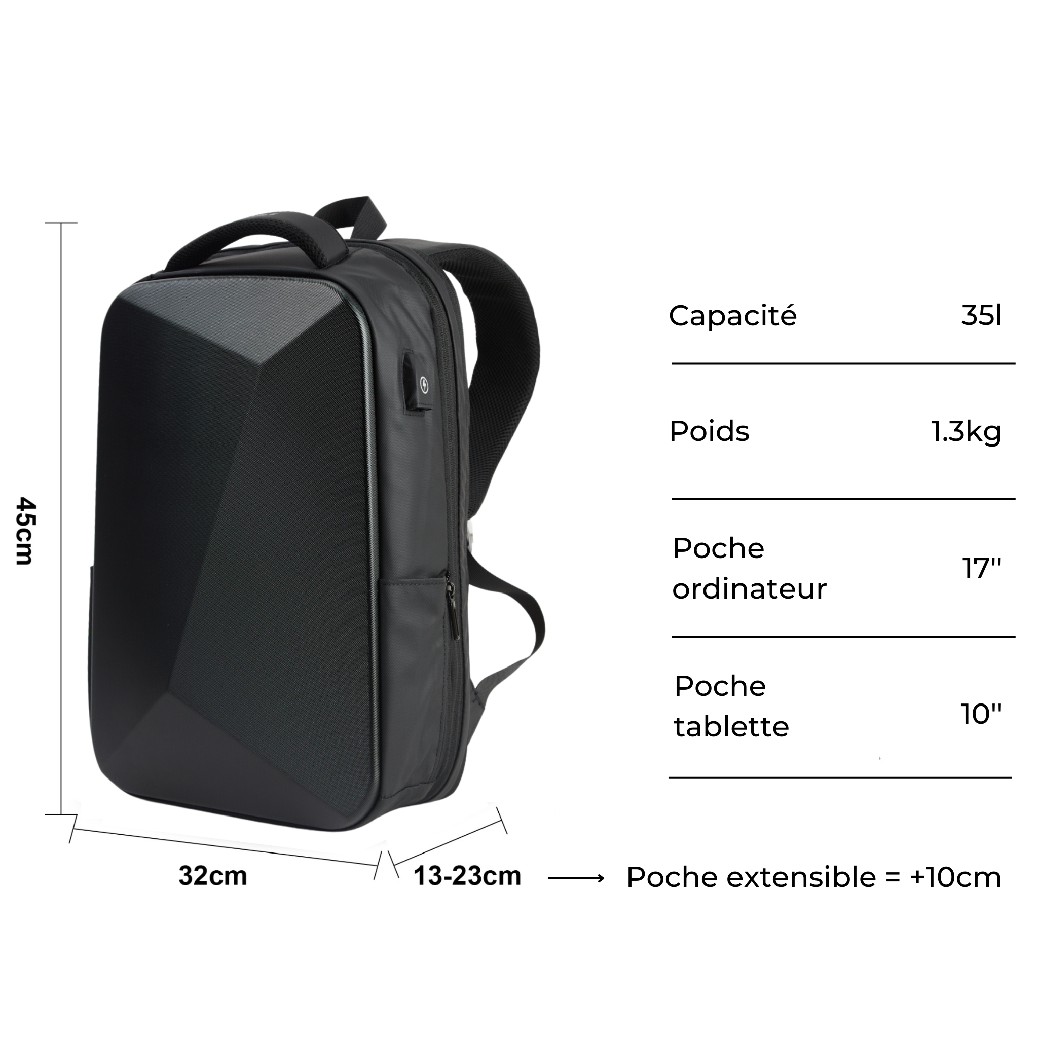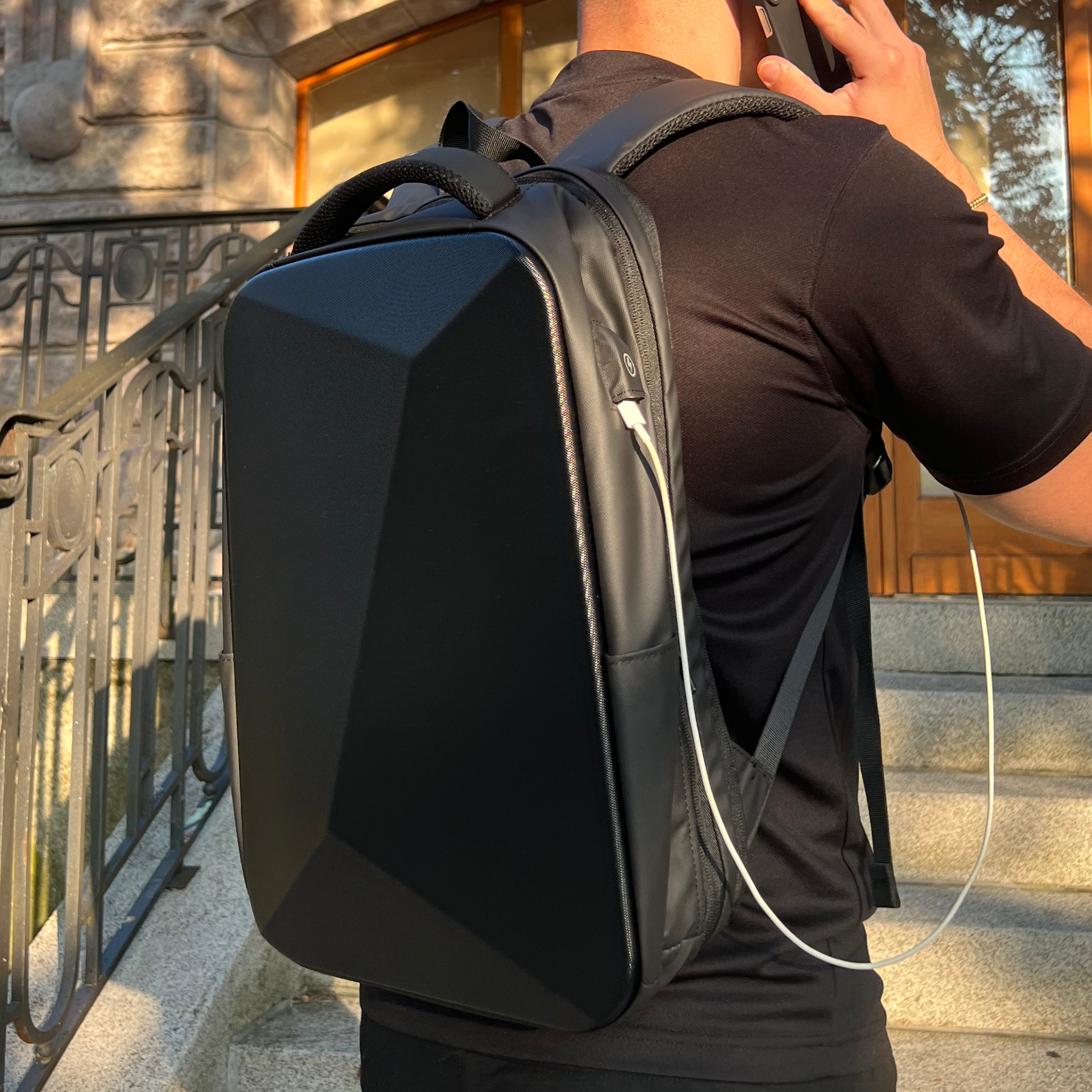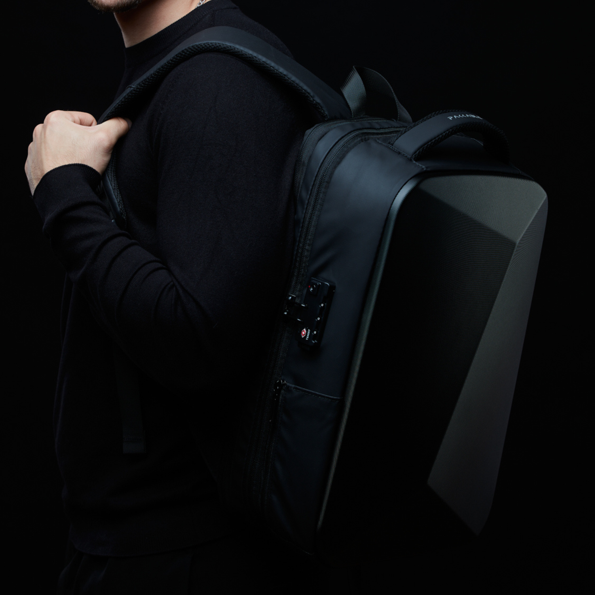 Souvent, un sac à dos spacieux est synonyme de sac volumineux qui privilégie l’aspect pratique à votre style. Notre objectif était précisément d'éviter cela. En mettant l'accent sur un design compact et un style unique en son genre, nous avons réussi à combiner esthétique et fonctionnalité. La couleur noire a été choisie pour sa capacité à s'harmoniser avec tous vos looks, tandis que la coque minimaliste en forme de diamant incarne l'élégance et l'esthétique épuré.