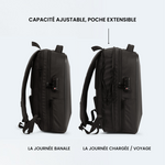 C’est grâce à une large capacité ajustable de 20 à 35 litres, associée à 9 compartiments compacts, que notre sac à dos vous permettra d’emporter tout ce dont vous aurez besoin sans aucune restriction. Vous pourrez aisément y ranger 3 t-shirts, 3 chemises, 3 pantalons, 3 slips, 3 paires de chaussettes, une trousse de toilette, 1 ordinateur, 1 iPad, 1 livre ainsi que vos essentiels personnels. Le tout, de manière organisée.